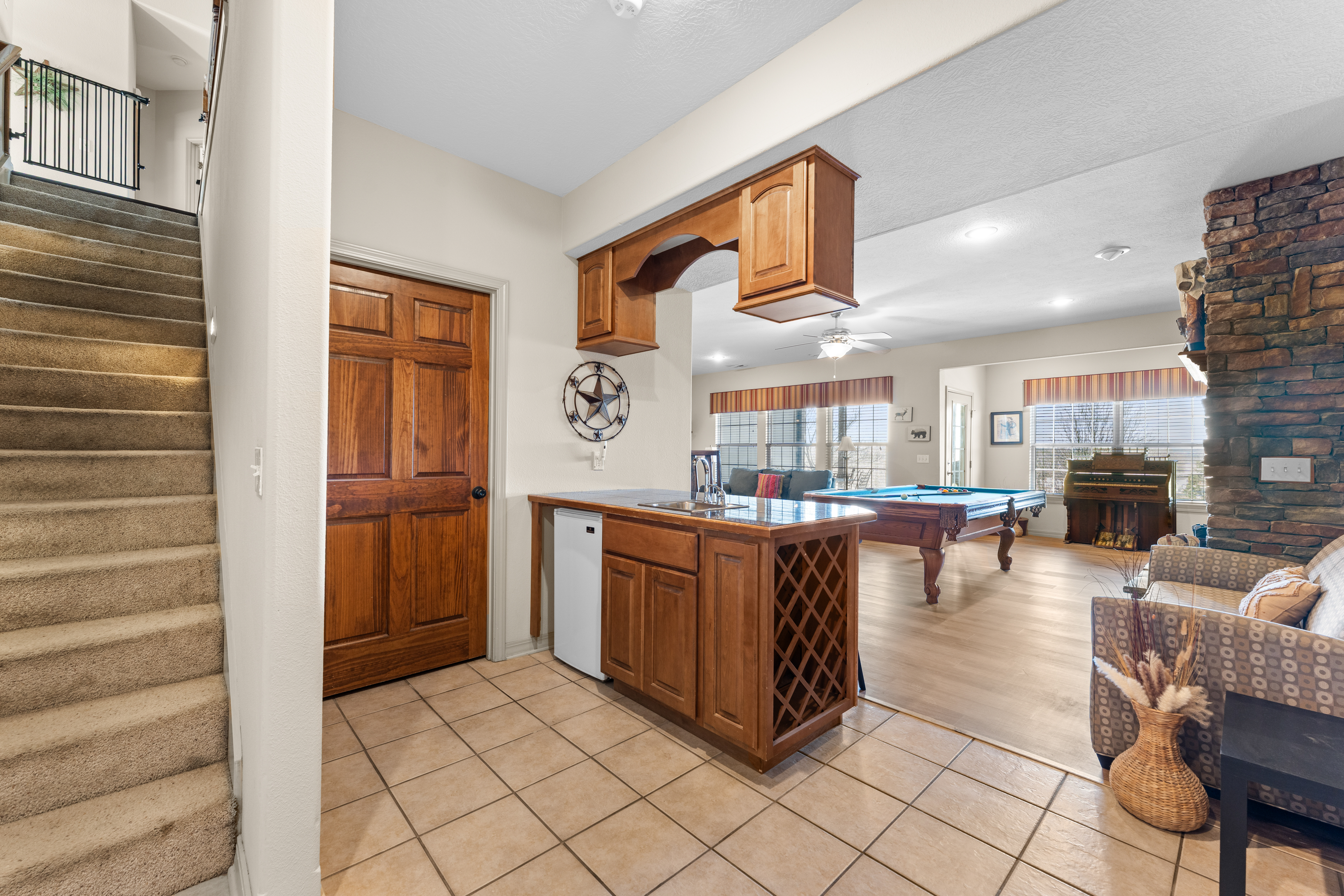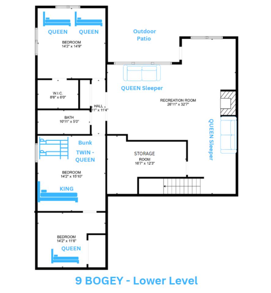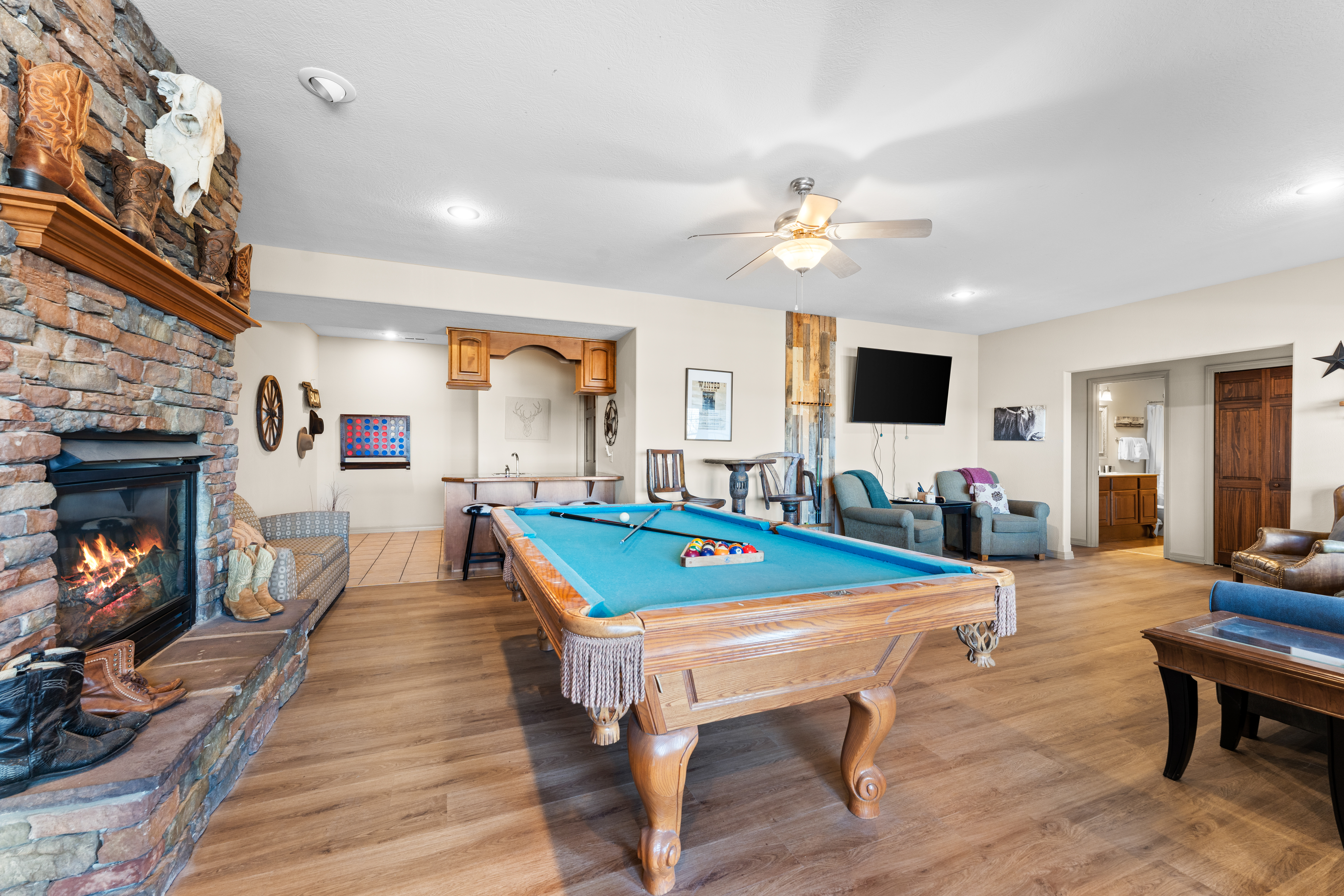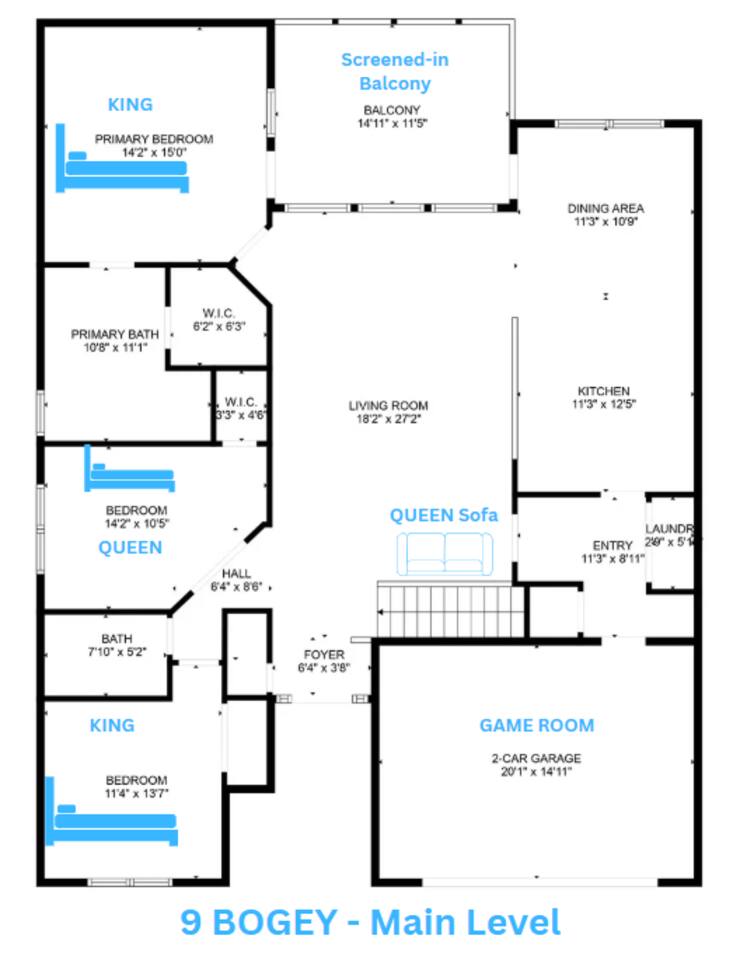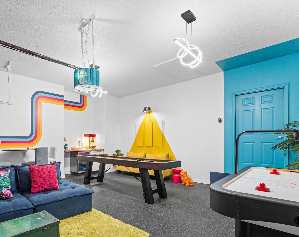 Rooms for Everyone Reunions require more than beds — they require flow. This nearly 3,500 sq ft home offers: • Multiple living areas to separate energy levels naturally • Upstairs living room, kitchen, and screened porch for adult gathering • Downstairs recreational room with direct patio and yard access • Dedicated game room (garage conversion) for teens and kids Adults can enjoy coffee on the screened porch while kids play downstairs. Grandparents can rest comfortably while still being close to the action. Everyone has space — without feeling disconnected. Sleeps Up to 20 Comfortably Designed to help you assign rooms confidently and avoid awkward sleeping politics. Upstairs • Bedroom 1: King bed with en suite bathroom (ideal for grandparents or primary hosts) • Bedroom 2: Queen bed • Bedroom 3: King bed • Living Room: Queen sofa sleeper Downstairs • Bedroom 4: Two Queen beds (great for cousins or sibling families) • Bedroom 5: King bed + Twin-over-Queen bunk • Bedroom 6 (bonus room through Bedroom 5): Queen bed • Living Room: Queen sofa sleeper Kings and Queens are ideal for parents, grandparents, adult couples, or older kids. Sofa sleepers are best suited for younger guests. Floorplan photos are included to make planning simple. Large Kitchen Designed for Group Use Cooking for large groups can feel overwhelming — this kitchen is set up to make it easier. The spacious kitchen is built for group cooking — with room for multiple people to prepare meals at once. Whether you're making big breakfasts before heading out or gathering to create a group dinner, the layout supports real group use. • Room for several cooks at once • Crockpot, bakeware, blender & kids dishes • Two coffee pots (because mornings matter) • Popcorn machine for family movie nights • BBQ grill for outdoor meals Morning coffee on the screened porch quickly becomes a favorite ritual Entertainment for Every Generation Kids & Teens • Dedicated game room • Air hockey & shuffleboard • Upright arcade games • Board games, cornhole & retro Atari hookups • Cowboy dress-up & selfie station • Resort pool access (2-minute walk to one of three pools, seasonal) Note: Pinball machine is no longer available Adults • Comfortable upstairs living room • Screened porch seating • Outdoor patio space • Pool Table • Roku TVs throughout the home • Wi-Fi for streaming and desk for remote work Grandparents • Quiet bedroom options • Easy proximity to main living areas • Peaceful resort setting without city noise