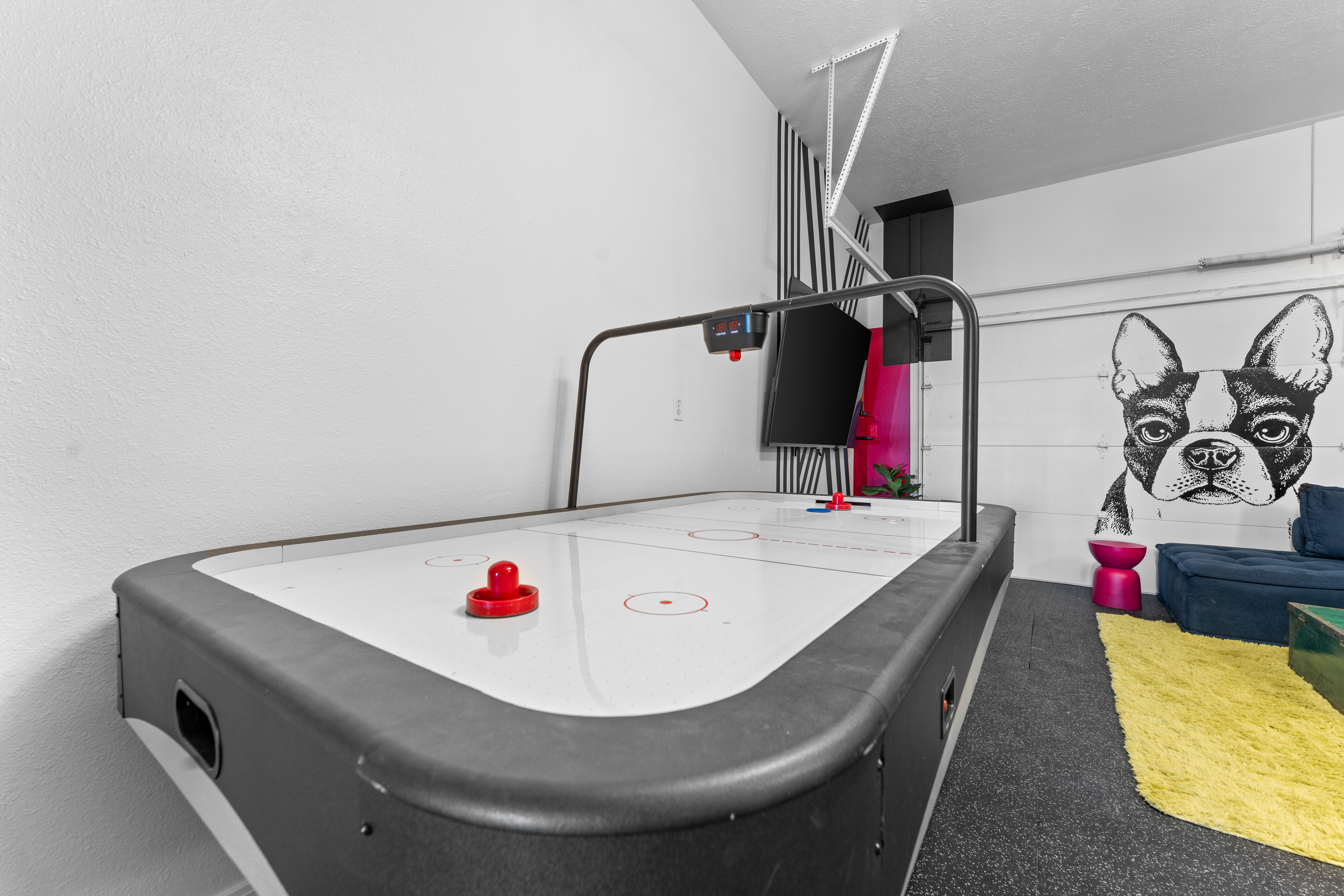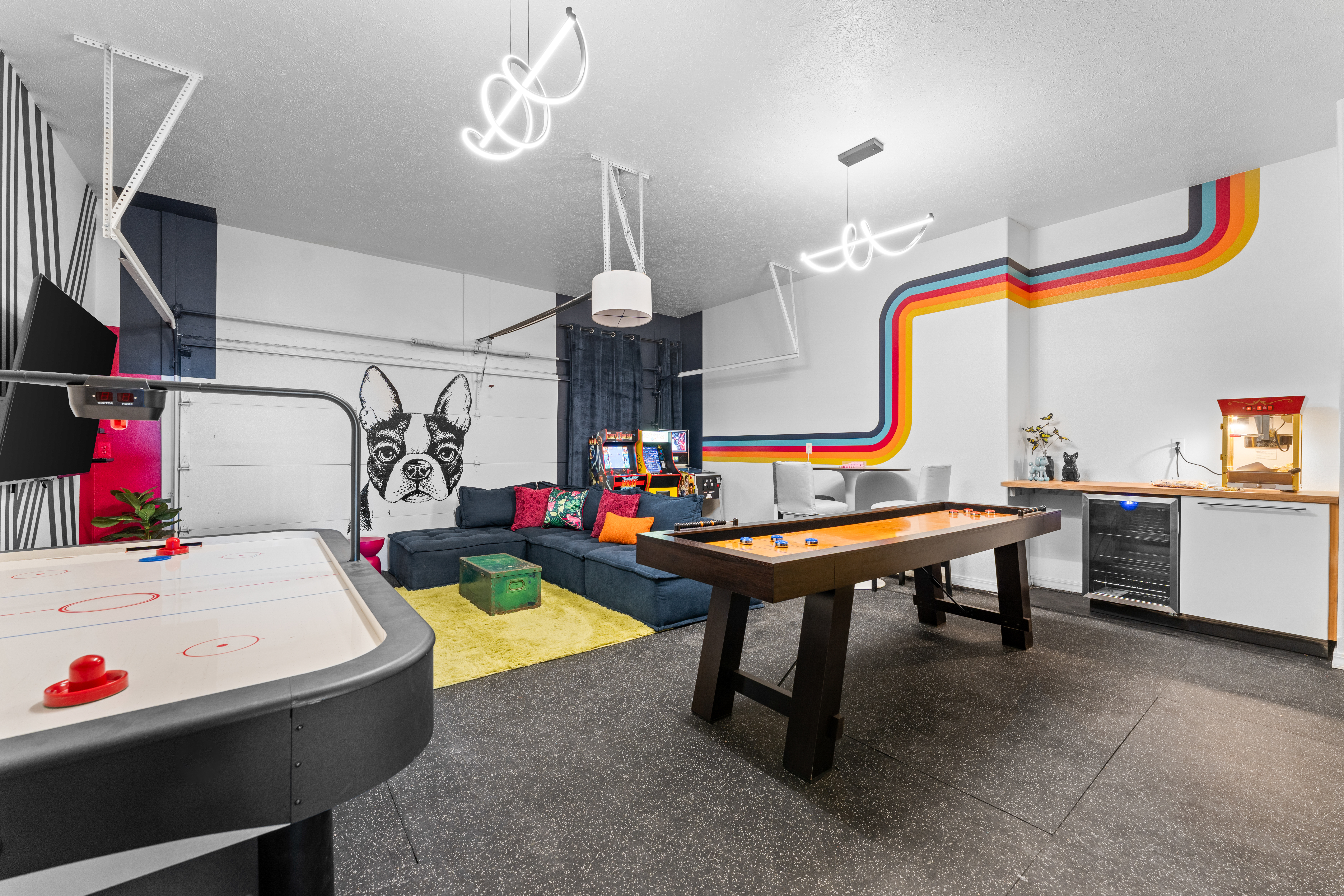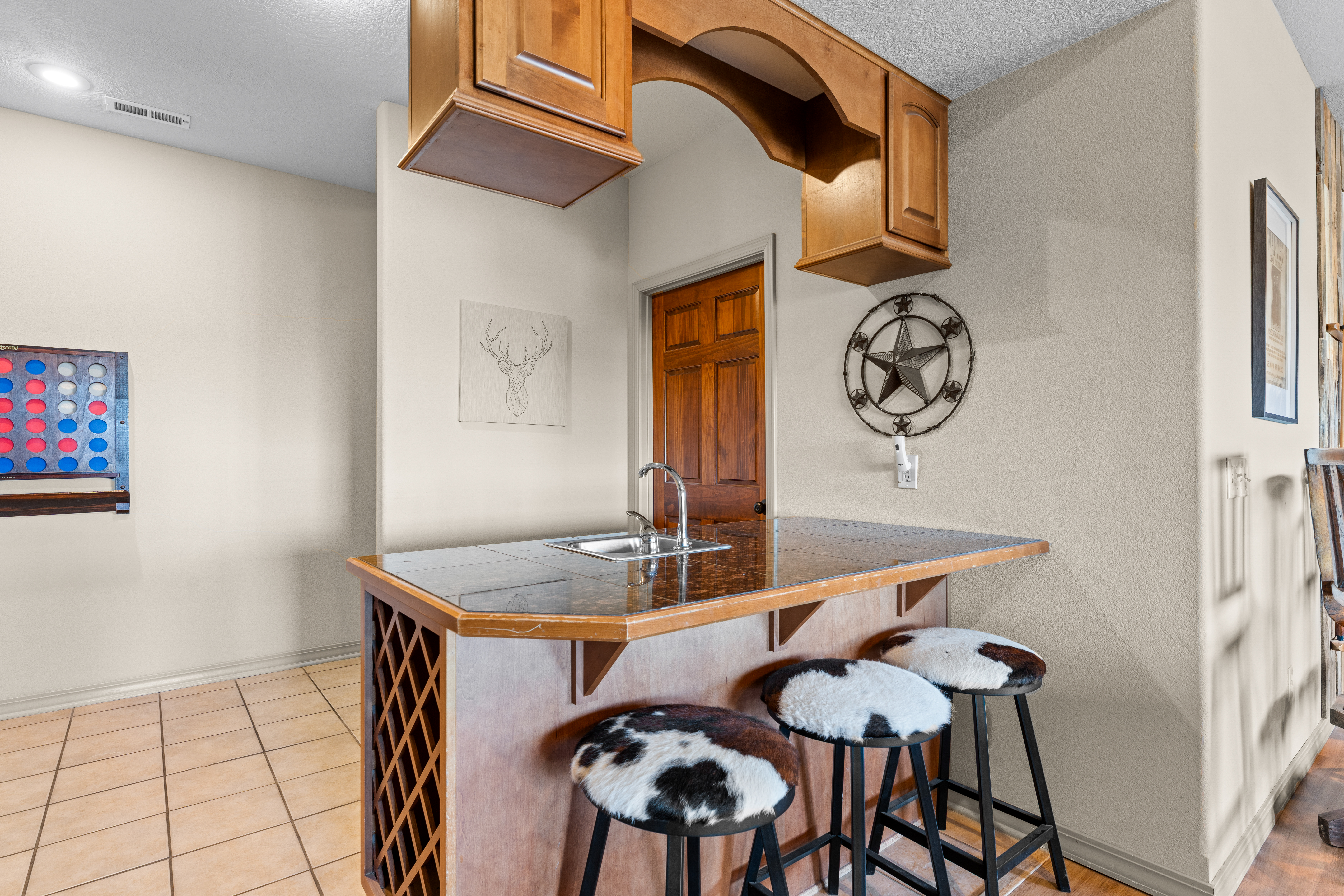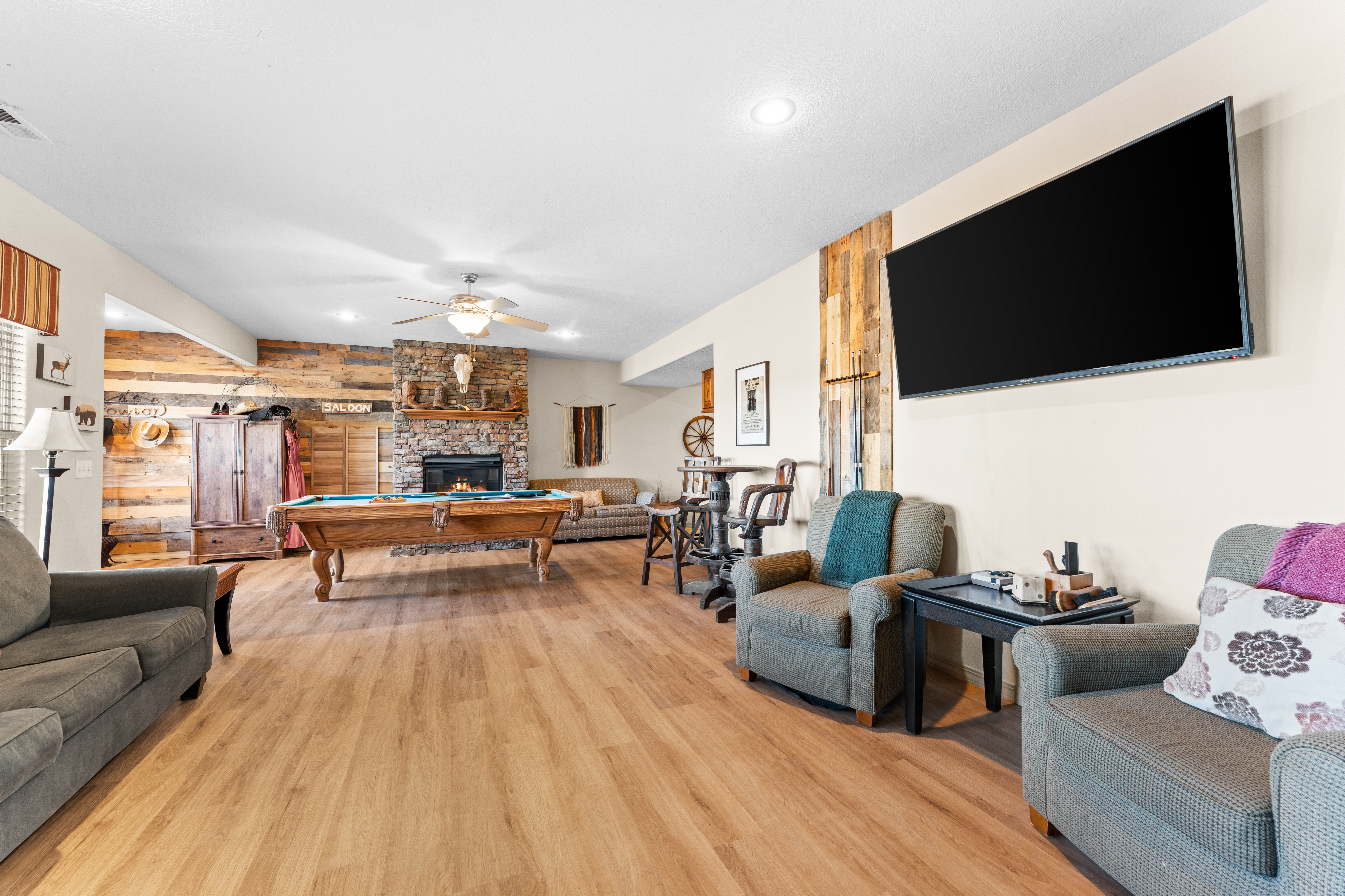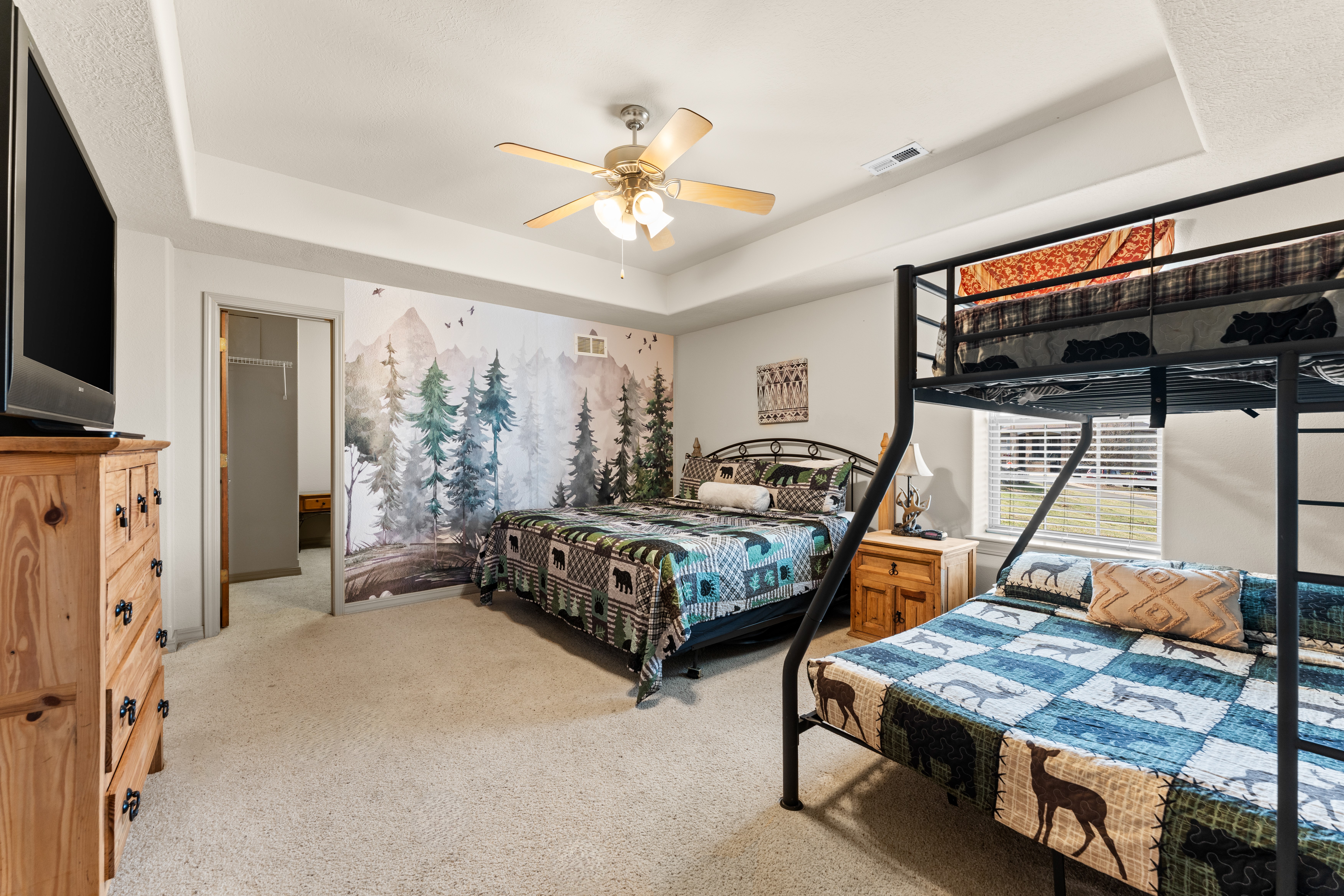 Rooms for Everyone Reunions require more than beds — they require flow. This nearly 3,500 sq ft home offers: • Multiple living areas to separate energy levels naturally • Upstairs living room, kitchen, and screened porch for adult gathering • Downstairs recreational room with direct patio and yard access • Dedicated game room (garage conversion) for teens and kids Adults can enjoy coffee on the screened porch while kids play downstairs. Grandparents can rest comfortably while still being close to the action. Everyone has space — without feeling disconnected. Sleeps Up to 20 Comfortably Designed to help you assign rooms confidently and avoid awkward sleeping politics. Upstairs • Bedroom 1: King bed with en suite bathroom (ideal for grandparents or primary hosts) • Bedroom 2: Queen bed • Bedroom 3: King bed • Living Room: Queen sofa sleeper Downstairs • Bedroom 4: Two Queen beds (great for cousins or sibling families) • Bedroom 5: King bed + Twin-over-Queen bunk • Bedroom 6 (bonus room through Bedroom 5): Queen bed • Living Room: Queen sofa sleeper Kings and Queens are ideal for parents, grandparents, adult couples, or older kids. Sofa sleepers are best suited for younger guests. Floorplan photos are included to make planning simple. Large Kitchen Designed for Group Use Cooking for large groups can feel overwhelming — this kitchen is set up to make it easier. The spacious kitchen is built for group cooking — with room for multiple people to prepare meals at once. Whether you're making big breakfasts before heading out or gathering to create a group dinner, the layout supports real group use. • Room for several cooks at once • Crockpot, bakeware, blender & kids dishes • Two coffee pots (because mornings matter) • Popcorn machine for family movie nights • BBQ grill for outdoor meals Morning coffee on the screened porch quickly becomes a favorite ritual Entertainment for Every Generation Kids & Teens • Dedicated game room • Air hockey & shuffleboard • Upright arcade games • Board games, cornhole & retro Atari hookups • Cowboy dress-up & selfie station • Resort pool access (2-minute walk to one of three pools, seasonal) Note: Pinball machine is no longer available Adults • Comfortable upstairs living room • Screened porch seating • Outdoor patio space • Pool Table • Roku TVs throughout the home • Wi-Fi for streaming and desk for remote work Grandparents • Quiet bedroom options • Easy proximity to main living areas • Peaceful resort setting without city noise
