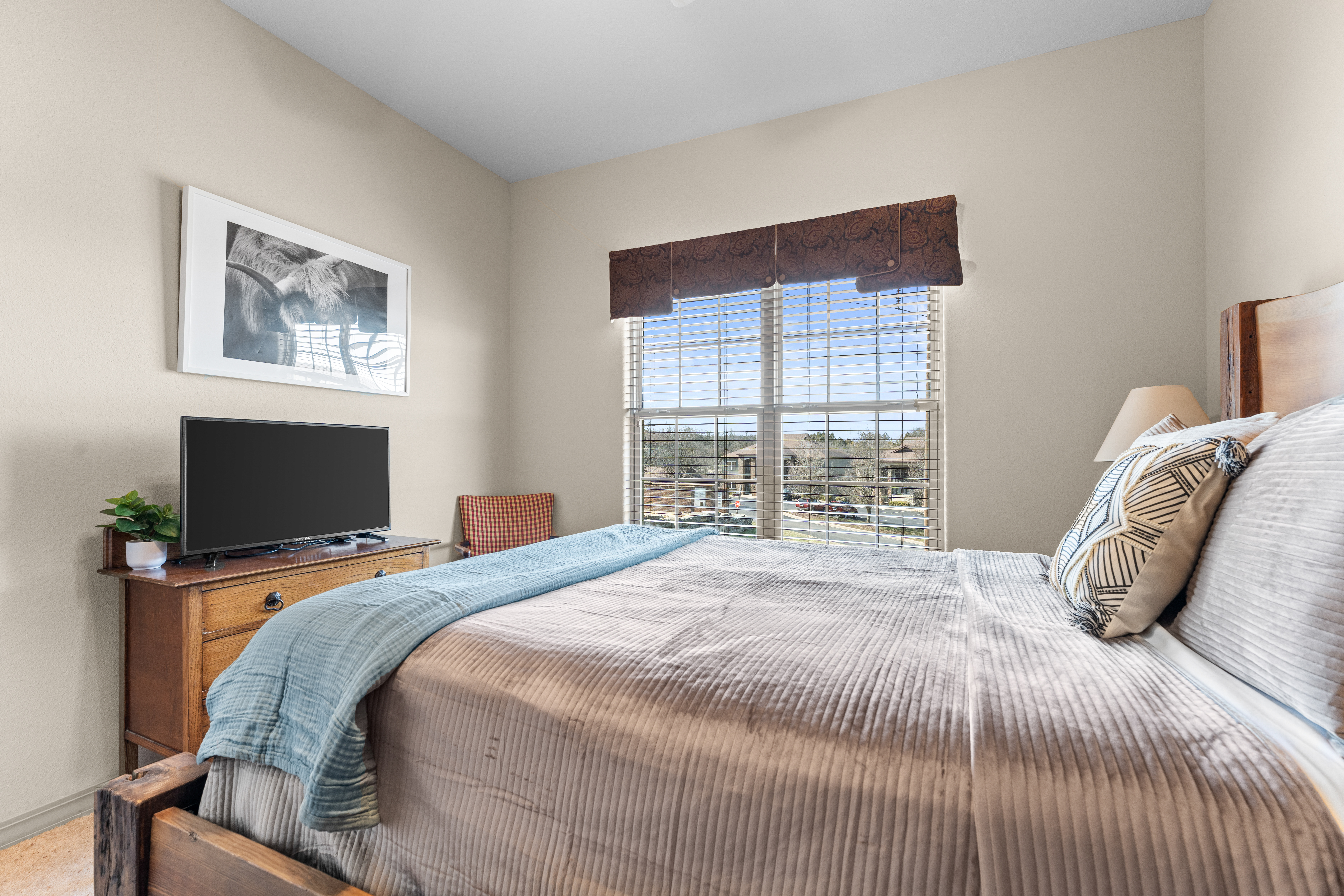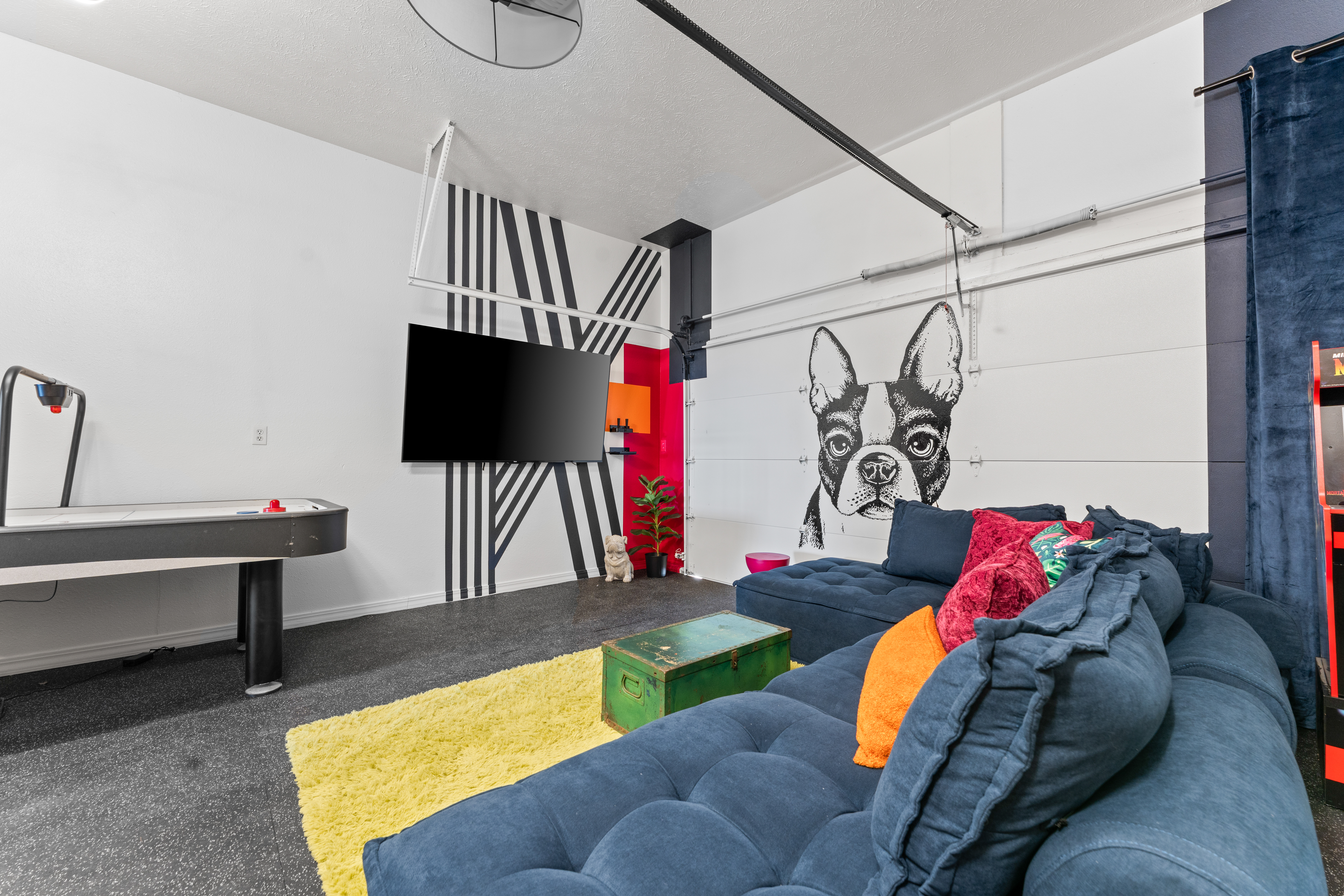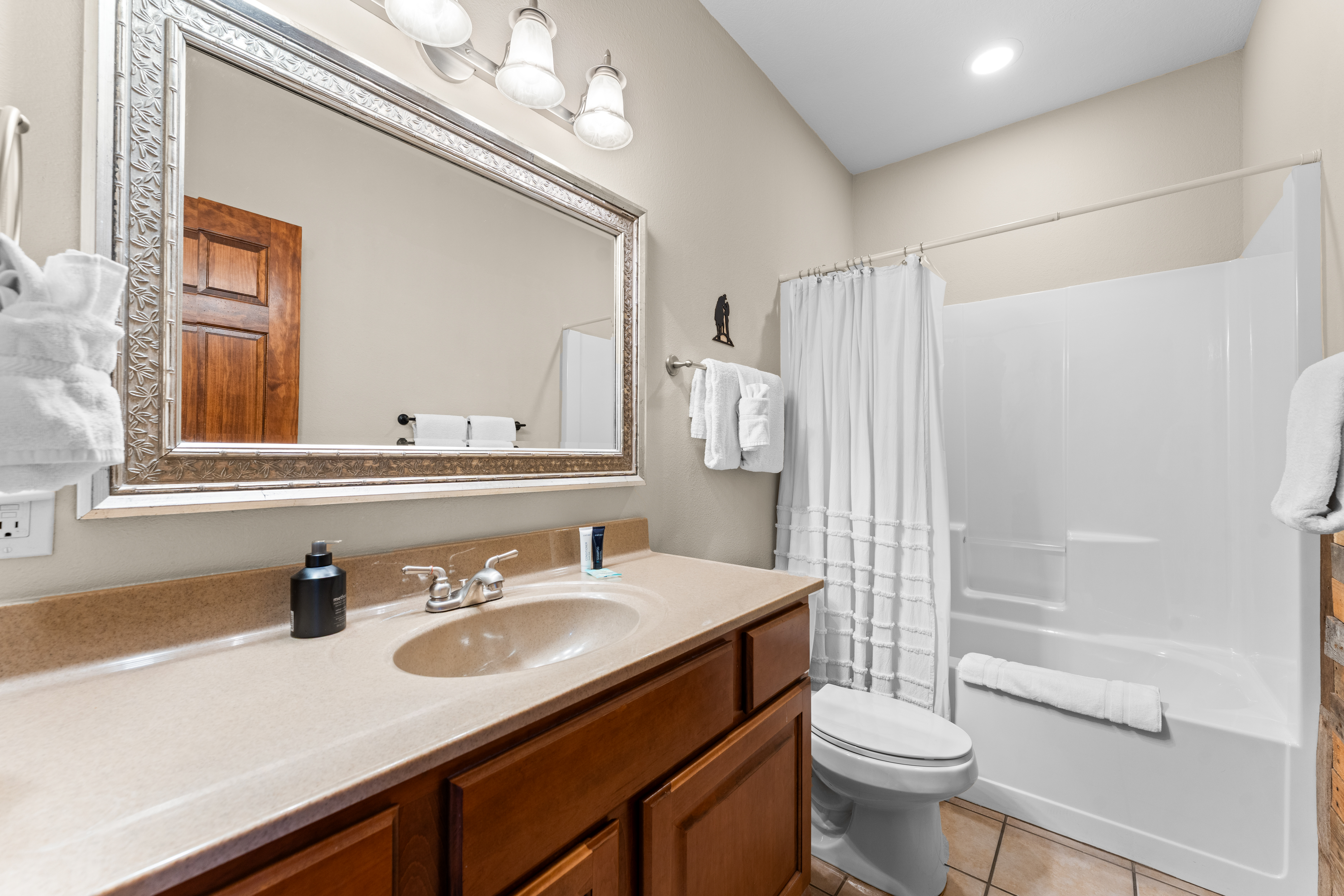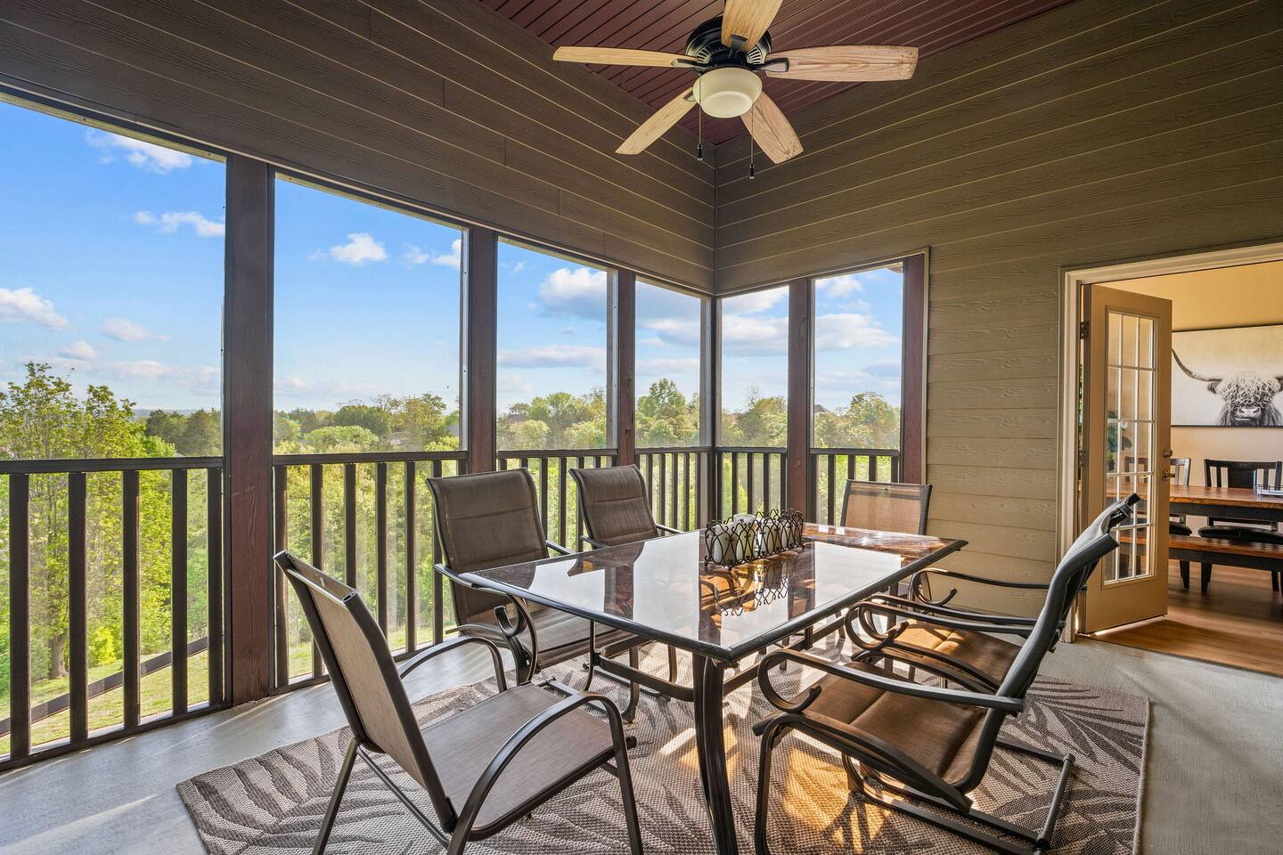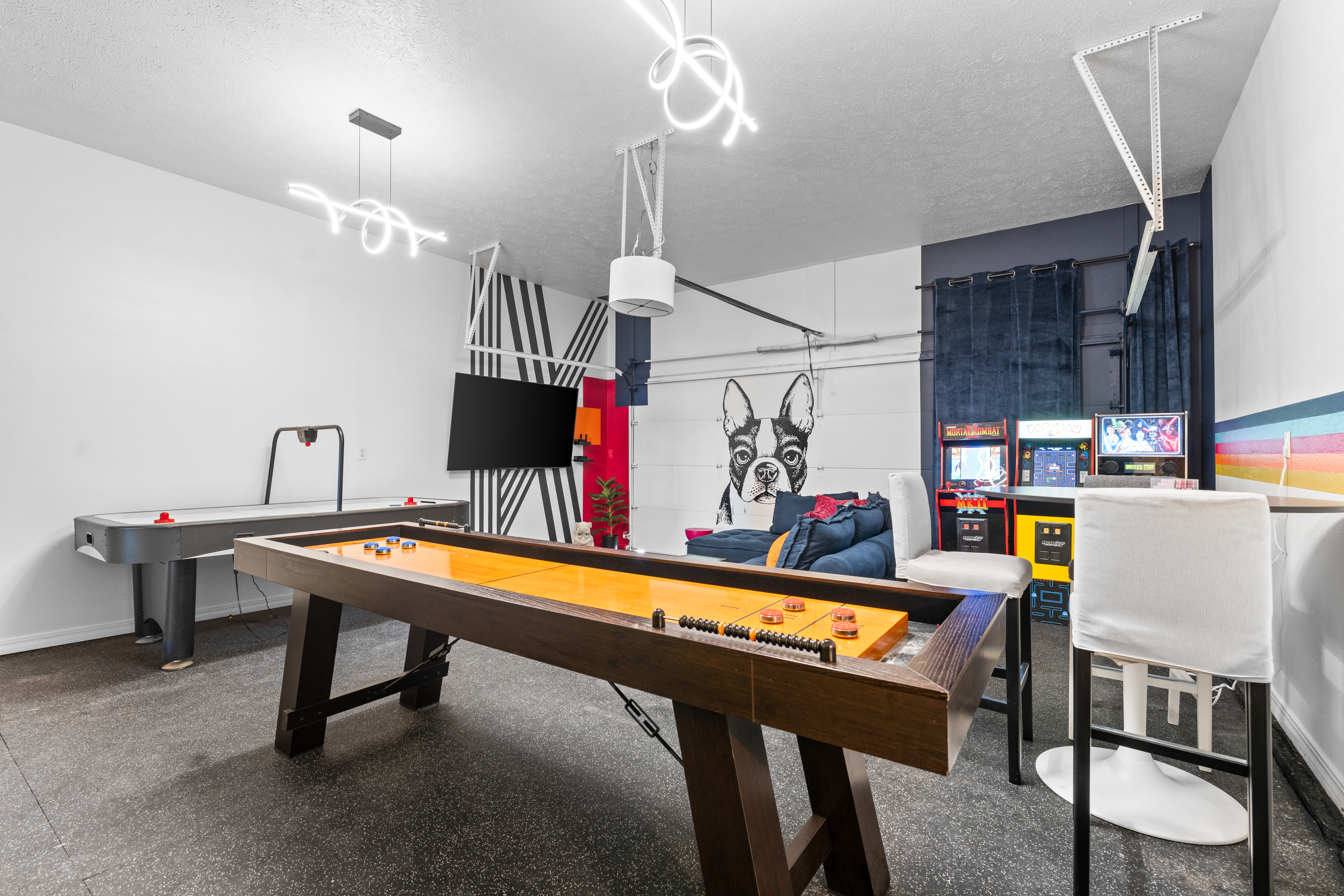 Rooms for Everyone Reunions require more than beds — they require flow. This nearly 3,500 sq ft home offers: • Multiple living areas to separate energy levels naturally • Upstairs living room, kitchen, and screened porch for adult gathering • Downstairs recreational room with direct patio and yard access • Dedicated game room (garage conversion) for teens and kids Adults can enjoy coffee on the screened porch while kids play downstairs. Grandparents can rest comfortably while still being close to the action. Everyone has space — without feeling disconnected. Sleeps Up to 20 Comfortably Designed to help you assign rooms confidently and avoid awkward sleeping politics. Upstairs • Bedroom 1: King bed with en suite bathroom (ideal for grandparents or primary hosts) • Bedroom 2: Queen bed • Bedroom 3: King bed • Living Room: Queen sofa sleeper Downstairs • Bedroom 4: Two Queen beds (great for cousins or sibling families) • Bedroom 5: King bed + Twin-over-Queen bunk • Bedroom 6 (bonus room through Bedroom 5): Queen bed • Living Room: Queen sofa sleeper Kings and Queens are ideal for parents, grandparents, adult couples, or older kids. Sofa sleepers are best suited for younger guests. Floorplan photos are included to make planning simple. Large Kitchen Designed for Group Use Cooking for large groups can feel overwhelming — this kitchen is set up to make it easier. The spacious kitchen is built for group cooking — with room for multiple people to prepare meals at once. Whether you're making big breakfasts before heading out or gathering to create a group dinner, the layout supports real group use. • Room for several cooks at once • Crockpot, bakeware, blender & kids dishes • Two coffee pots (because mornings matter) • Popcorn machine for family movie nights • BBQ grill for outdoor meals Morning coffee on the screened porch quickly becomes a favorite ritual Entertainment for Every Generation Kids & Teens • Dedicated game room • Air hockey & shuffleboard • Upright arcade games • Board games, cornhole & retro Atari hookups • Cowboy dress-up & selfie station • Resort pool access (2-minute walk to one of three pools, seasonal) Note: Pinball machine is no longer available Adults • Comfortable upstairs living room • Screened porch seating • Outdoor patio space • Pool Table • Roku TVs throughout the home • Wi-Fi for streaming and desk for remote work Grandparents • Quiet bedroom options • Easy proximity to main living areas • Peaceful resort setting without city noise
