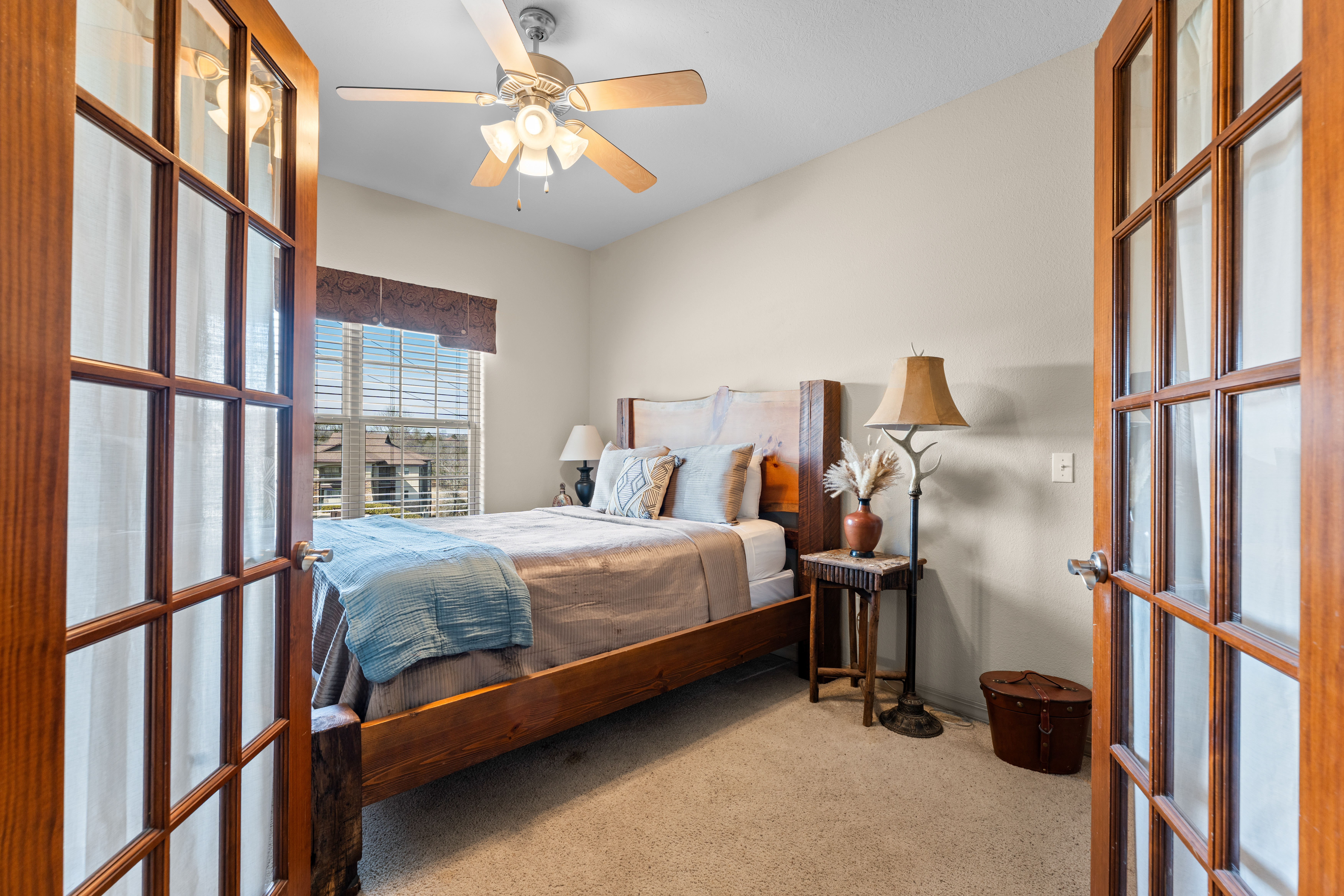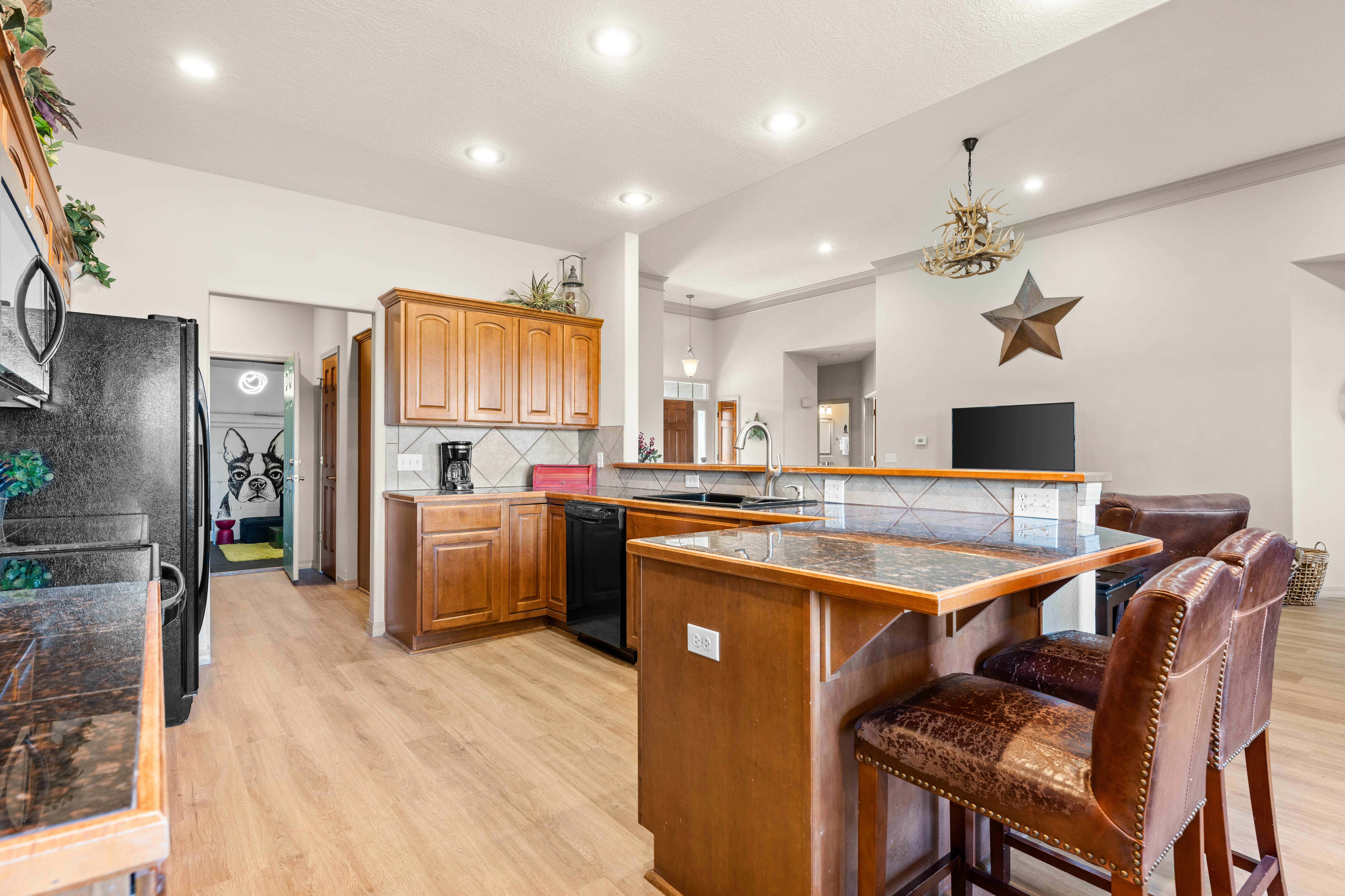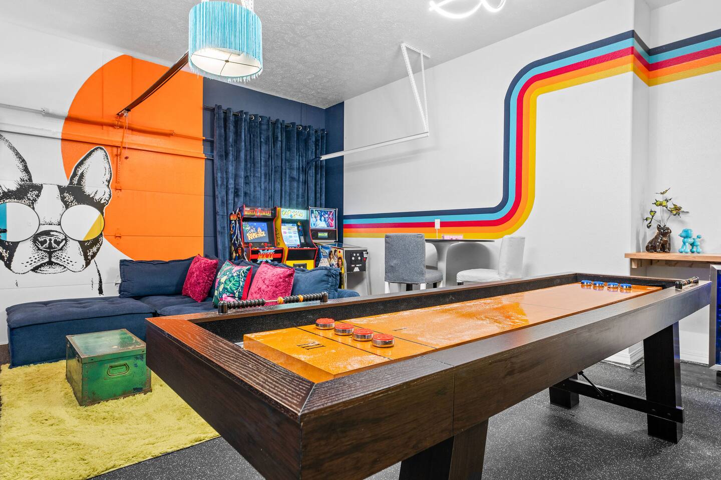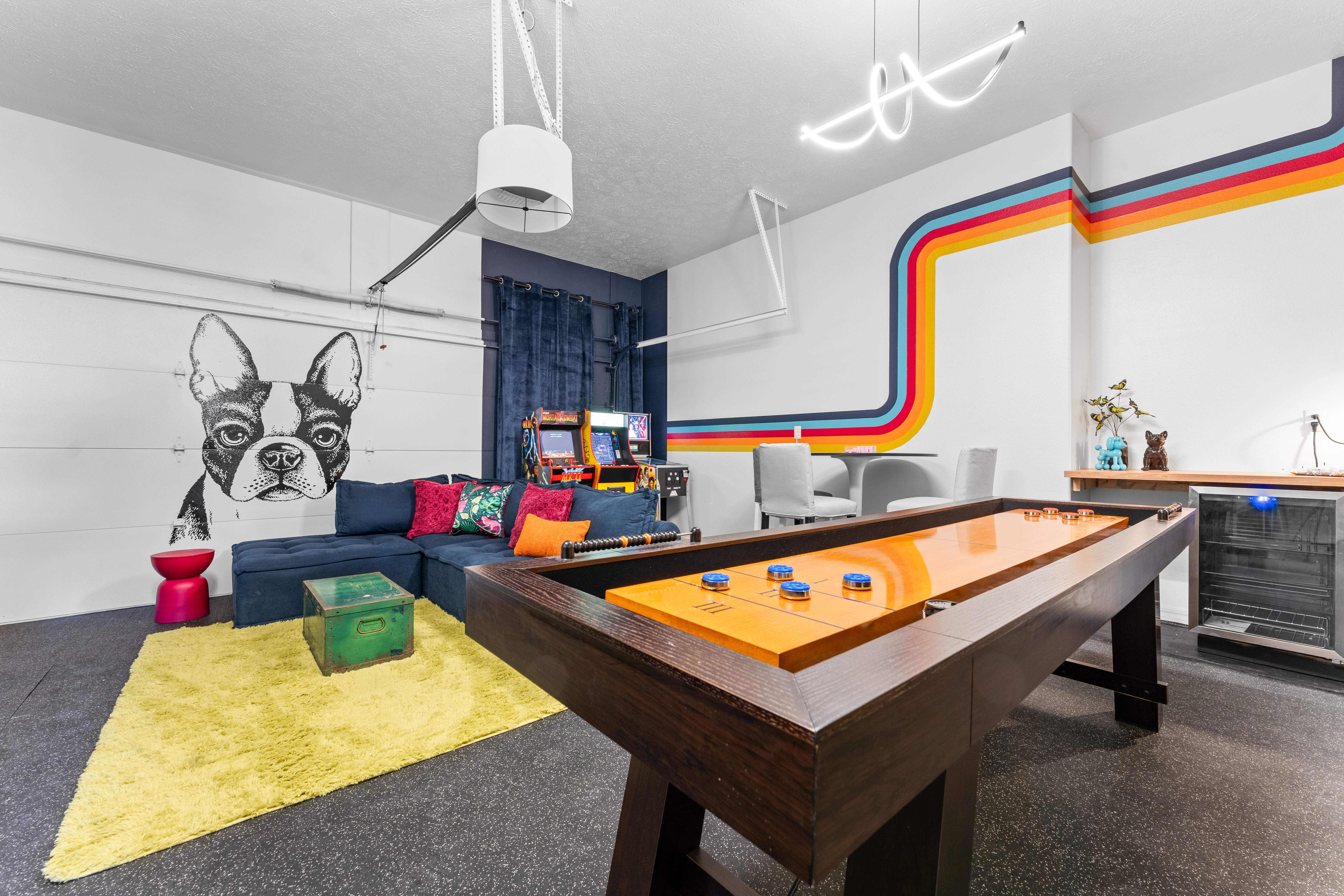 Rooms for Everyone Reunions require more than beds — they require flow. This nearly 3,500 sq ft home offers: • Multiple living areas to separate energy levels naturally • Upstairs living room, kitchen, and screened porch for adult gathering • Downstairs recreational room with direct patio and yard access • Dedicated game room (garage conversion) for teens and kids Adults can enjoy coffee on the screened porch while kids play downstairs. Grandparents can rest comfortably while still being close to the action. Everyone has space — without feeling disconnected. Sleeps Up to 20 Comfortably Designed to help you assign rooms confidently and avoid awkward sleeping politics. Upstairs • Bedroom 1: King bed with en suite bathroom (ideal for grandparents or primary hosts) • Bedroom 2: Queen bed • Bedroom 3: King bed • Living Room: Queen sofa sleeper Downstairs • Bedroom 4: Two Queen beds (great for cousins or sibling families) • Bedroom 5: King bed + Twin-over-Queen bunk • Bedroom 6 (bonus room through Bedroom 5): Queen bed • Living Room: Queen sofa sleeper Kings and Queens are ideal for parents, grandparents, adult couples, or older kids. Sofa sleepers are best suited for younger guests. Floorplan photos are included to make planning simple. Large Kitchen Designed for Group Use Cooking for large groups can feel overwhelming — this kitchen is set up to make it easier. The spacious kitchen is built for group cooking — with room for multiple people to prepare meals at once. Whether you're making big breakfasts before heading out or gathering to create a group dinner, the layout supports real group use. • Room for several cooks at once • Crockpot, bakeware, blender & kids dishes • Two coffee pots (because mornings matter) • Popcorn machine for family movie nights • BBQ grill for outdoor meals Morning coffee on the screened porch quickly becomes a favorite ritual Entertainment for Every Generation Kids & Teens • Dedicated game room • Air hockey & shuffleboard • Upright arcade games • Board games, cornhole & retro Atari hookups • Cowboy dress-up & selfie station • Resort pool access (2-minute walk to one of three pools, seasonal) Note: Pinball machine is no longer available Adults • Comfortable upstairs living room • Screened porch seating • Outdoor patio space • Pool Table • Roku TVs throughout the home • Wi-Fi for streaming and desk for remote work Grandparents • Quiet bedroom options • Easy proximity to main living areas • Peaceful resort setting without city noise