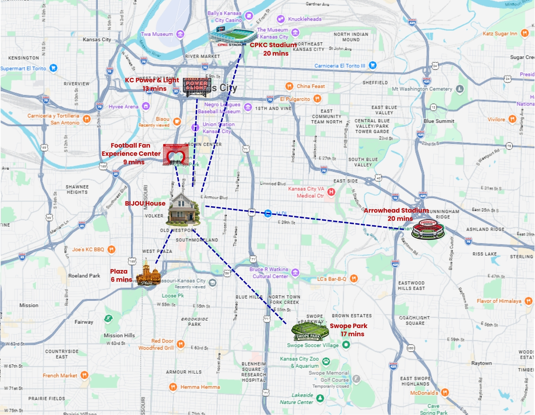 BIJOU HOUSE offers a stylish experience at this centrally-located historic home - part of the early Westport settlement! Freshly renovated with luxury updates to offer your group a delightful stay while you explore Kansas City. Located in WESTPORT, you can walk to restaurants & bars! - 28 RESTAURANTS/BARS and kitschy retro & antique SHOPS within .3 miles - 5 min drive to COUNTRY CLUB PLAZA - 10 min to downtown & convention center - 20 min to stadiums No LOCALS without GREAT reviews Allowed