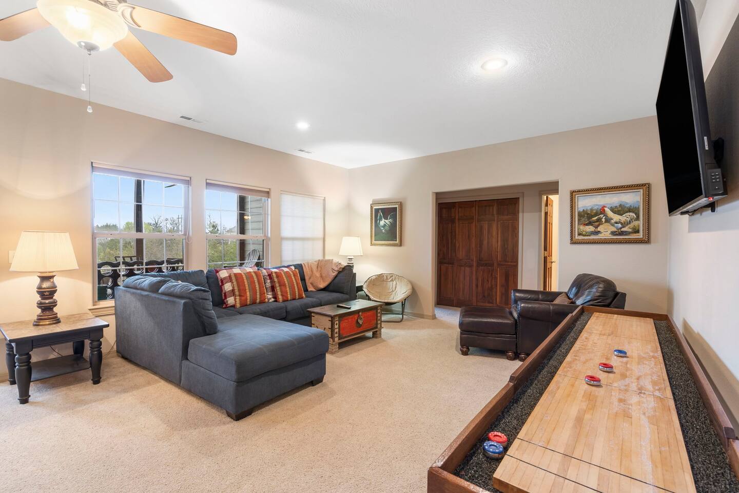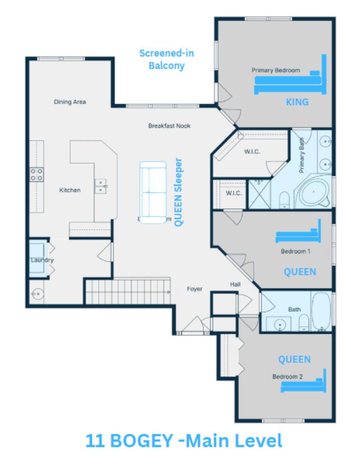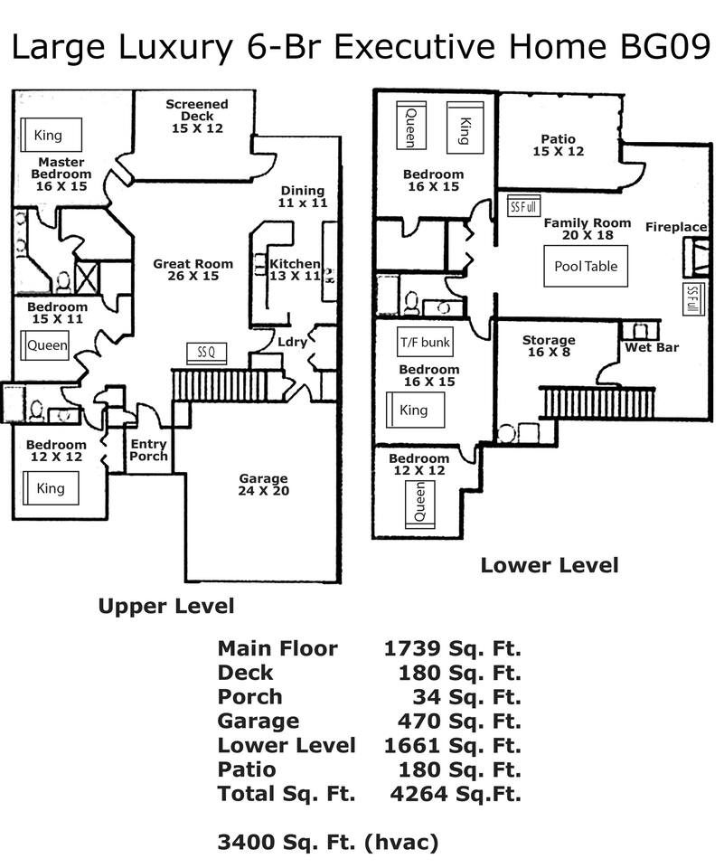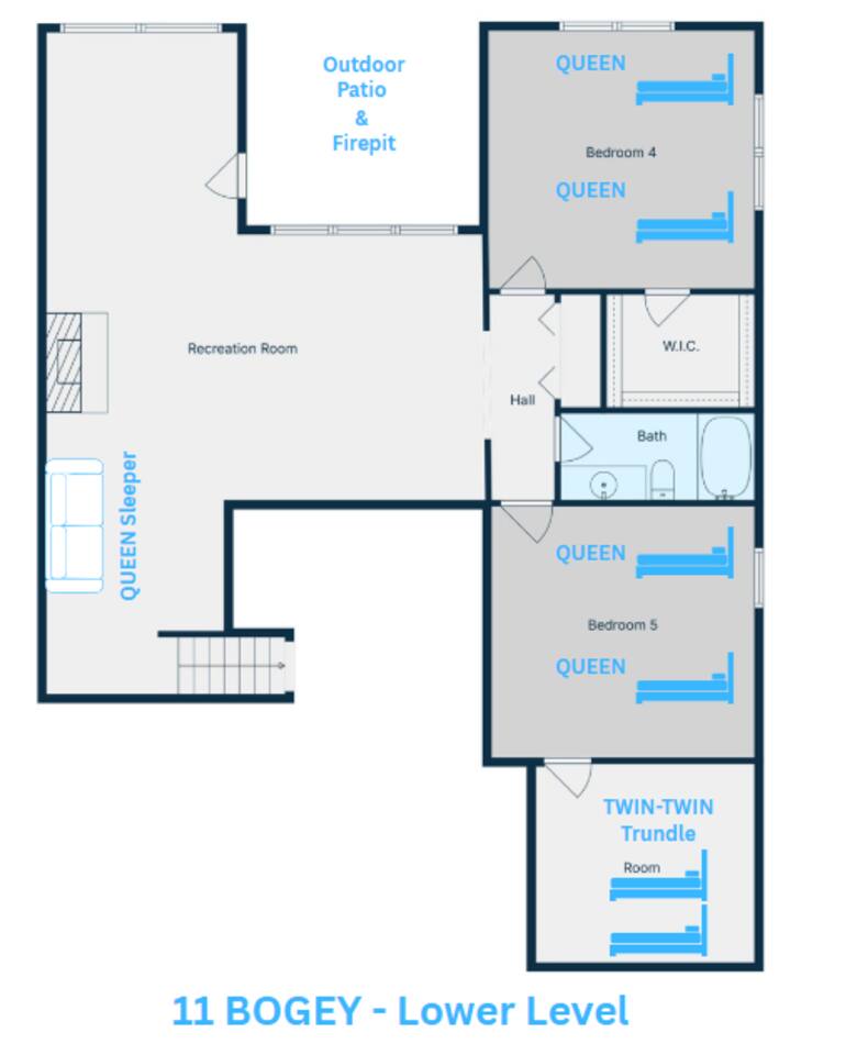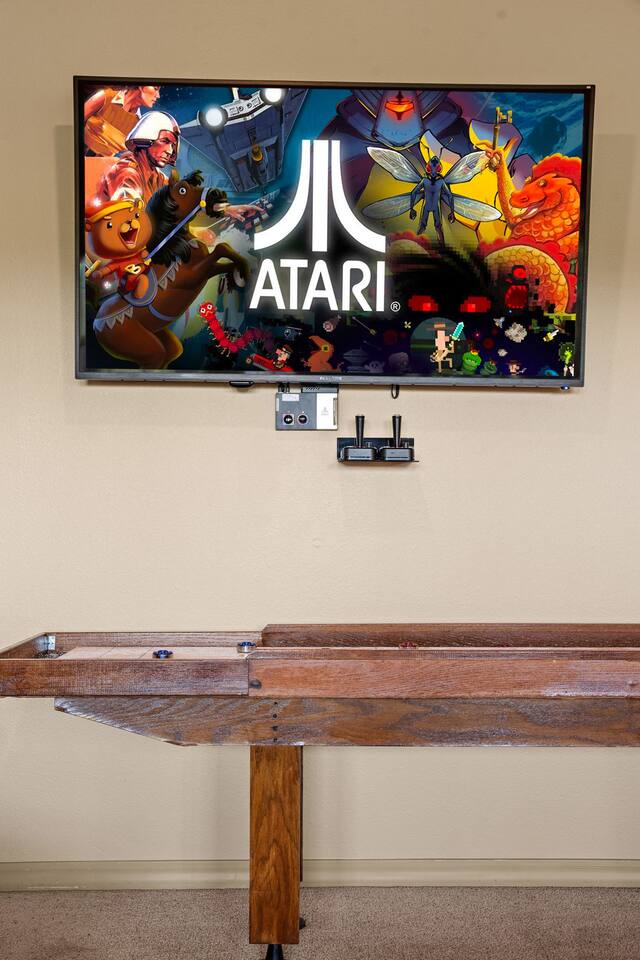 By combining both sides (9 & 11 Bogey), you’ll have: • 2 full kitchens • 2 main living rooms • 2 recreation rooms • 2 screened-in porches • 2 open patios • Dedicated game and toddler play areas • Multiple gathering zones to separate energy levels Adults can gather upstairs in one unit while teens enjoy the recreational rooms in the other. Families can divide by household if desired. Grandparents can rest quietly while still being close to the action. The spaces are fully separate inside, offering added privacy, and guests can easily move between them using the front or back exterior entrances. Two side-by-side homes allow natural grouping — reducing noise overlap and sleeping politics. Our Bedroom Lay-Out Sleeps up to 40 guests across 12 bedrooms plus additional sleeping areas. 9 Bogey (Cowboy Side – Pool Table) Upstairs • Bedroom 1: King bed with en suite bathroom (ideal for grandparents or primary hosts) • Bedroom 2: Queen bed • Bedroom 3: King bed • Living Room: Queen sofa sleeper Downstairs • Bedroom 4: Two Queen beds (great for cousins or sibling families) • Bedroom 5: King bed + Twin-over-Queen bunk • Bedroom 6 (bonus room through Bedroom 5): Queen bed • Living Room: Queen sofa sleeper 11 Bogey (Americana Side – Toddler Play Area) Upstairs • Bedroom 1: King bed with en suite bathroom (ideal for grandparents or primary hosts) • Bedroom 2: Queen bed • Bedroom 3: Queen bed Downstairs • Bedroom 4: 2 Queens • Bedroom 5: 2 Queens • Bedroom 6 (bonus room through Bedroom 5): Twin over Twin trundle • Queen sofa sleeper Kings and Queens are ideal for parents, grandparents, couples or older children. Sofa sleepers are best suited for younger guests. Floorplans for both units are available to help you assign rooms confidently before arrival. Kitchen Built for Reunion-Scale Meals With two full kitchens, your group can divide meal preparation naturally — easing congestion and making large-scale cooking manageable. Each kitchen includes: • Cookware & bakeware • Multiple coffee makers • Space for several cooks at once • Outdoor grill access • Additional beverage refrigerators downstairs Whether one side prepares breakfast and the other handles dinner, or families cook separately and gather together — the layout supports real coordination. Entertainment for Every Generation Large game room as well as 2 other entertainment spaces Kids & Teens • Pool table • Two shuffleboards • Arcade, Air hockey & Retro Atari games • Skee-ball • Toddler play area • Board games & cornhole Note: Pinball machine is no longer available Adults • Multiple living areas for conversation • 2 Screened porches with views • 2 Outdoor patio seating spaces • Quiet corners for early mornings or late-night talks Grandparents • King suite options • Peaceful resort setting • Ability to stay close to family without constant noise This separation reduces stress — and keeps everyone happy.