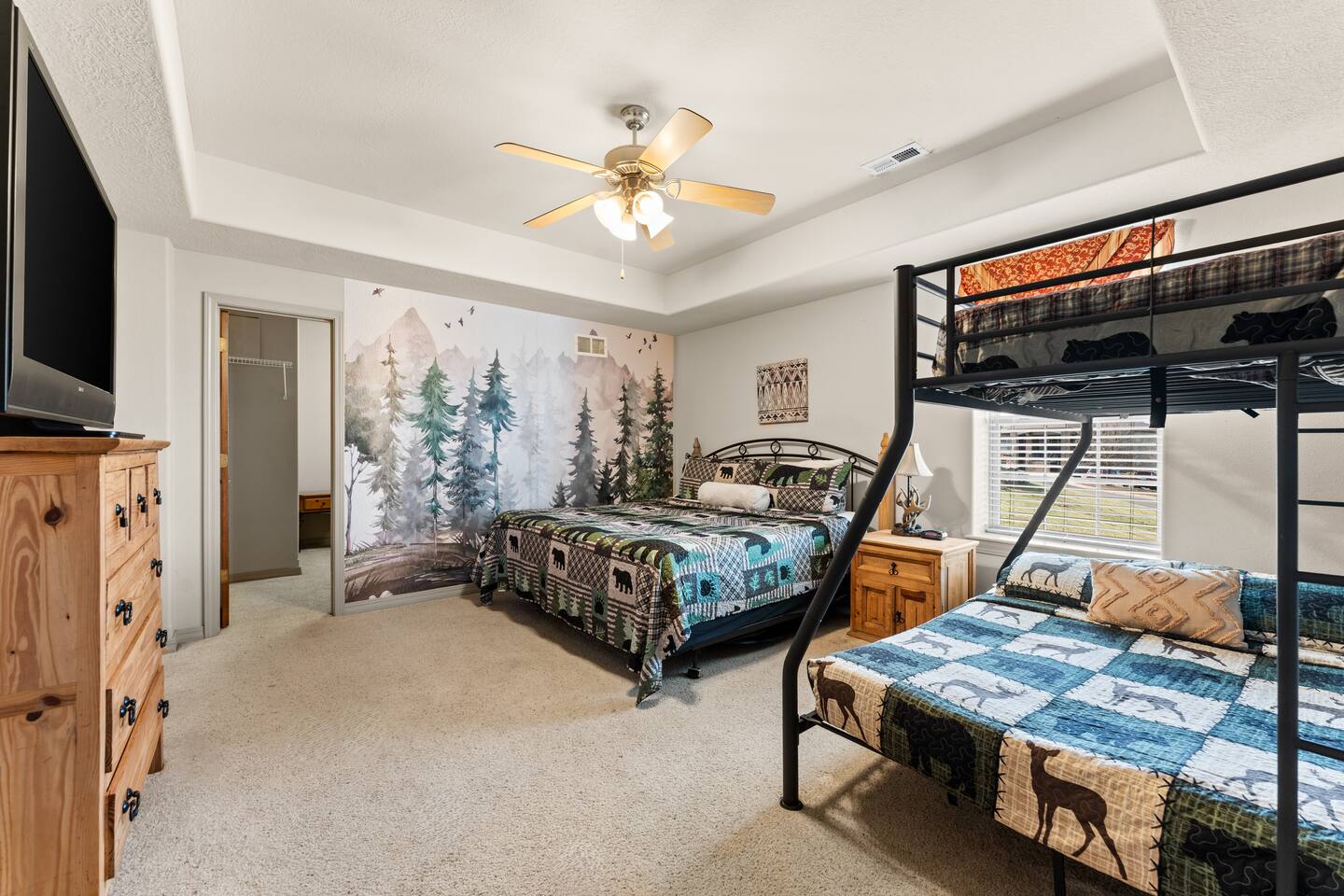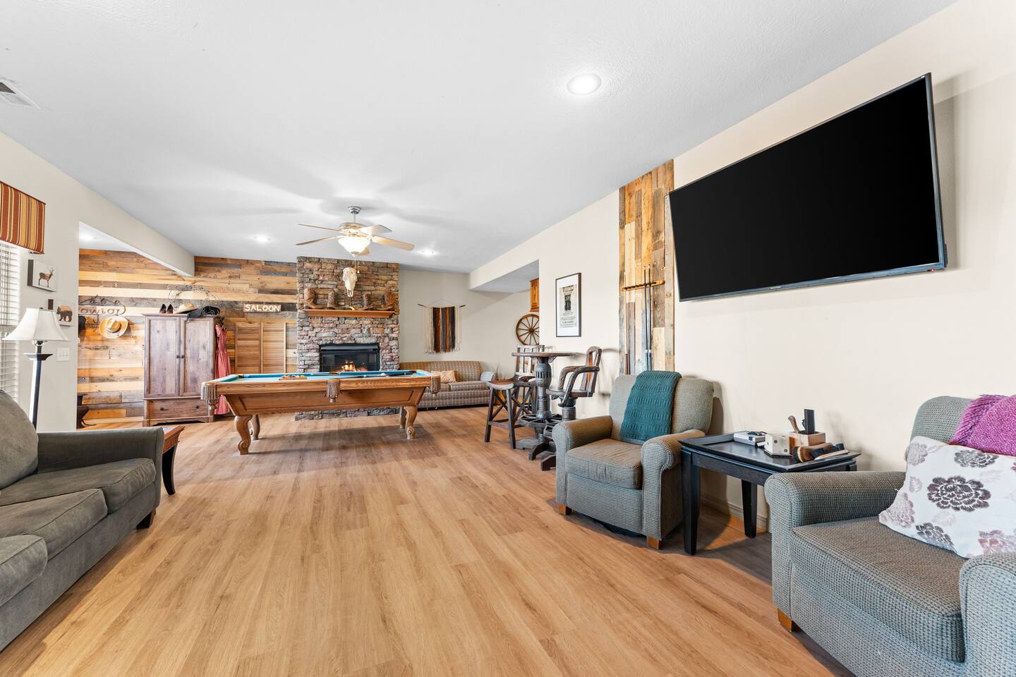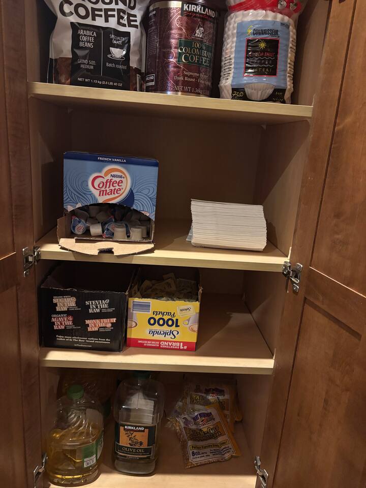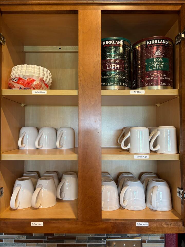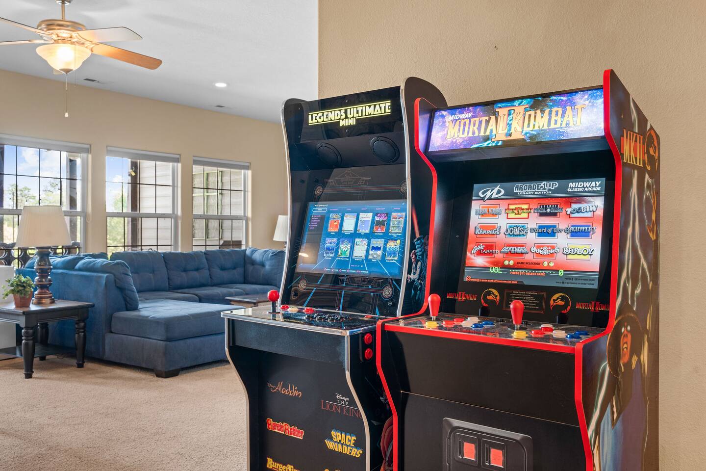 By combining both sides (9 & 11 Bogey), you’ll have: • 2 full kitchens • 2 main living rooms • 2 recreation rooms • 2 screened-in porches • 2 open patios • Dedicated game and toddler play areas • Multiple gathering zones to separate energy levels Adults can gather upstairs in one unit while teens enjoy the recreational rooms in the other. Families can divide by household if desired. Grandparents can rest quietly while still being close to the action. The spaces are fully separate inside, offering added privacy, and guests can easily move between them using the front or back exterior entrances. Two side-by-side homes allow natural grouping — reducing noise overlap and sleeping politics. Our Bedroom Lay-Out Sleeps up to 40 guests across 12 bedrooms plus additional sleeping areas. 9 Bogey (Cowboy Side – Pool Table) Upstairs • Bedroom 1: King bed with en suite bathroom (ideal for grandparents or primary hosts) • Bedroom 2: Queen bed • Bedroom 3: King bed • Living Room: Queen sofa sleeper Downstairs • Bedroom 4: Two Queen beds (great for cousins or sibling families) • Bedroom 5: King bed + Twin-over-Queen bunk • Bedroom 6 (bonus room through Bedroom 5): Queen bed • Living Room: Queen sofa sleeper 11 Bogey (Americana Side – Toddler Play Area) Upstairs • Bedroom 1: King bed with en suite bathroom (ideal for grandparents or primary hosts) • Bedroom 2: Queen bed • Bedroom 3: Queen bed Downstairs • Bedroom 4: 2 Queens • Bedroom 5: 2 Queens • Bedroom 6 (bonus room through Bedroom 5): Twin over Twin trundle • Queen sofa sleeper Kings and Queens are ideal for parents, grandparents, couples or older children. Sofa sleepers are best suited for younger guests. Floorplans for both units are available to help you assign rooms confidently before arrival. Kitchen Built for Reunion-Scale Meals With two full kitchens, your group can divide meal preparation naturally — easing congestion and making large-scale cooking manageable. Each kitchen includes: • Cookware & bakeware • Multiple coffee makers • Space for several cooks at once • Outdoor grill access • Additional beverage refrigerators downstairs Whether one side prepares breakfast and the other handles dinner, or families cook separately and gather together — the layout supports real coordination. Entertainment for Every Generation Large game room as well as 2 other entertainment spaces Kids & Teens • Pool table • Two shuffleboards • Arcade, Air hockey & Retro Atari games • Skee-ball • Toddler play area • Board games & cornhole Note: Pinball machine is no longer available Adults • Multiple living areas for conversation • 2 Screened porches with views • 2 Outdoor patio seating spaces • Quiet corners for early mornings or late-night talks Grandparents • King suite options • Peaceful resort setting • Ability to stay close to family without constant noise This separation reduces stress — and keeps everyone happy.