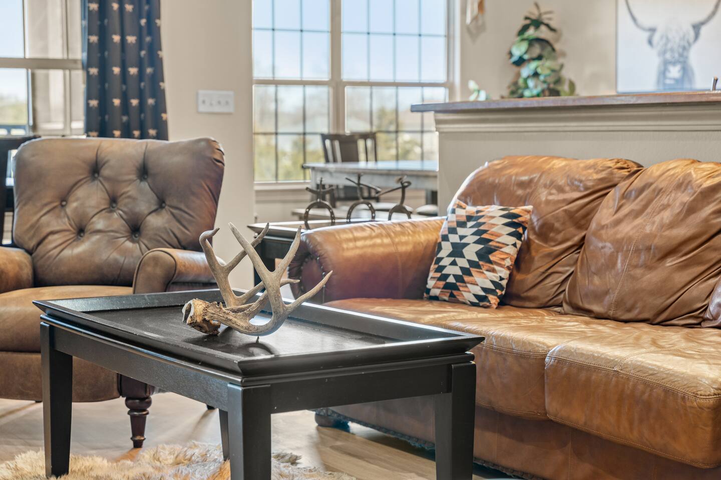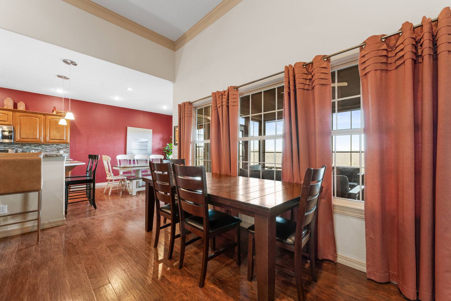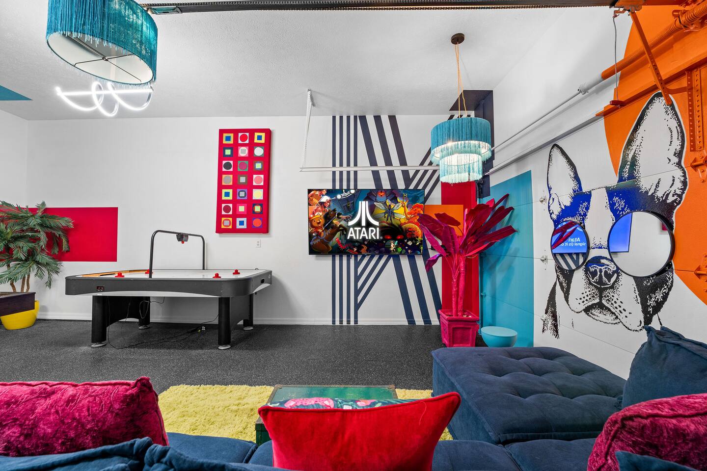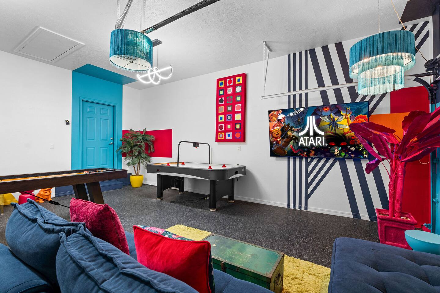 By combining both sides (9 & 11 Bogey), you’ll have: • 2 full kitchens • 2 main living rooms • 2 recreation rooms • 2 screened-in porches • 2 open patios • Dedicated game and toddler play areas • Multiple gathering zones to separate energy levels Adults can gather upstairs in one unit while teens enjoy the recreational rooms in the other. Families can divide by household if desired. Grandparents can rest quietly while still being close to the action. The spaces are fully separate inside, offering added privacy, and guests can easily move between them using the front or back exterior entrances. Two side-by-side homes allow natural grouping — reducing noise overlap and sleeping politics. Our Bedroom Lay-Out Sleeps up to 40 guests across 12 bedrooms plus additional sleeping areas. 9 Bogey (Cowboy Side – Pool Table) Upstairs • Bedroom 1: King bed with en suite bathroom (ideal for grandparents or primary hosts) • Bedroom 2: Queen bed • Bedroom 3: King bed • Living Room: Queen sofa sleeper Downstairs • Bedroom 4: Two Queen beds (great for cousins or sibling families) • Bedroom 5: King bed + Twin-over-Queen bunk • Bedroom 6 (bonus room through Bedroom 5): Queen bed • Living Room: Queen sofa sleeper 11 Bogey (Americana Side – Toddler Play Area) Upstairs • Bedroom 1: King bed with en suite bathroom (ideal for grandparents or primary hosts) • Bedroom 2: Queen bed • Bedroom 3: Queen bed Downstairs • Bedroom 4: 2 Queens • Bedroom 5: 2 Queens • Bedroom 6 (bonus room through Bedroom 5): Twin over Twin trundle • Queen sofa sleeper Kings and Queens are ideal for parents, grandparents, couples or older children. Sofa sleepers are best suited for younger guests. Floorplans for both units are available to help you assign rooms confidently before arrival. Kitchen Built for Reunion-Scale Meals With two full kitchens, your group can divide meal preparation naturally — easing congestion and making large-scale cooking manageable. Each kitchen includes: • Cookware & bakeware • Multiple coffee makers • Space for several cooks at once • Outdoor grill access • Additional beverage refrigerators downstairs Whether one side prepares breakfast and the other handles dinner, or families cook separately and gather together — the layout supports real coordination. Entertainment for Every Generation Large game room as well as 2 other entertainment spaces Kids & Teens • Pool table • Two shuffleboards • Arcade, Air hockey & Retro Atari games • Skee-ball • Toddler play area • Board games & cornhole Note: Pinball machine is no longer available Adults • Multiple living areas for conversation • 2 Screened porches with views • 2 Outdoor patio seating spaces • Quiet corners for early mornings or late-night talks Grandparents • King suite options • Peaceful resort setting • Ability to stay close to family without constant noise This separation reduces stress — and keeps everyone happy.